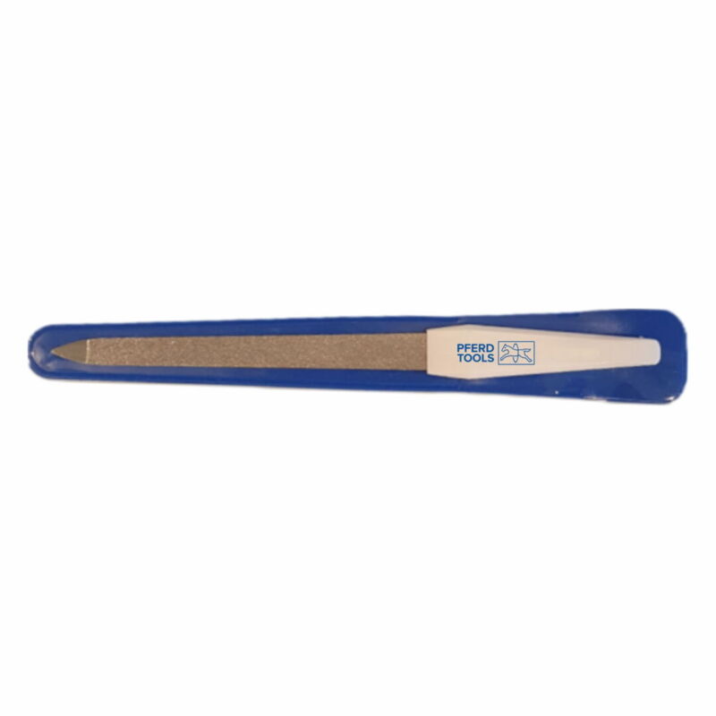 Nagelfeile mit einer groben und einer feinen Seite in blauem Kunststoffetui.