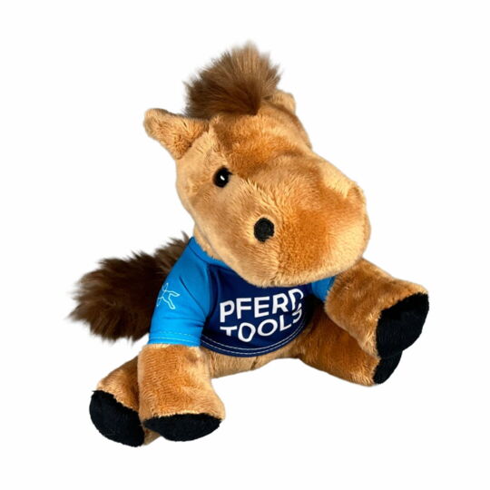 Das Plüschpferd ist rotbraun, mit wuscheliger Mähne und trägt ein T-Shirt im PFERD TOOLS Style.